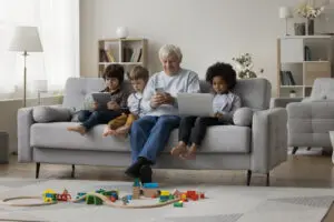 Older grandpa watching multiethnic grandkids, resting on couch