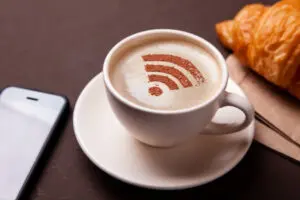 Cup of coffee with WiFi sign on foam. Free access point to the Internet WiFi. I like coffee break with croissant